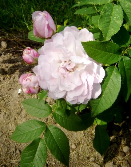 | Det här är en riktigt vacker gallica. Blomman formar ett fluff av skira ljust rosa kronblad. Knopparna är det allra älskligaste man kan tänka sig. Den kallades tidigare för "Vaxblomman", antagligen för att bladen nästan är genomskinliga mot slutet. Om den nu bara vore vacker - men den doftar ljuvligt också. |