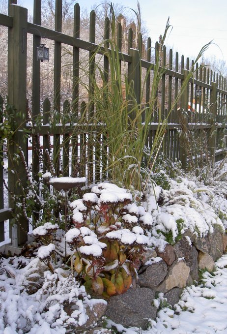 Här syns en favorit till - gullbandsgräset. Oj vad det växer! Och det är stadigt utan att vara stelt, varje liten vindpust får det att "bläddra" i de vackra bladen. Och det står stolt med snö i plymerna, vackert även så här års! (Här har Guirlande d'Amour växt lite, och syns lite tydligare, vid närmsta stolpen.) |