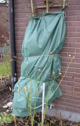 Vinterväv kan man skydda klätterrosor med tidig vår/vinter. En kraftig väv som köps på metervara och kan användas många år.
