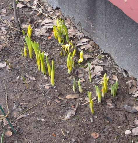 Påskliljor på väg upp intill husväggen 19.4 -06.