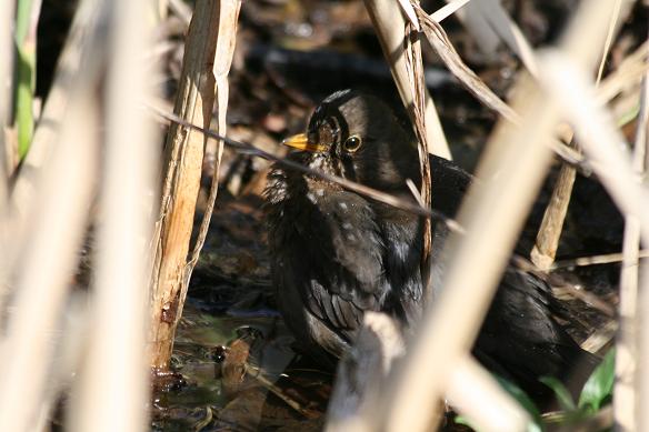 > Koltrast tar sig ett dopp i dammen