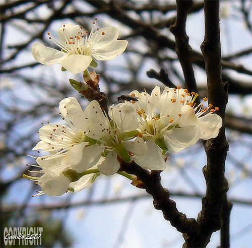 Även plommonträdet står i full blom 070428 ... här är några blommor med ett litet flygfä på