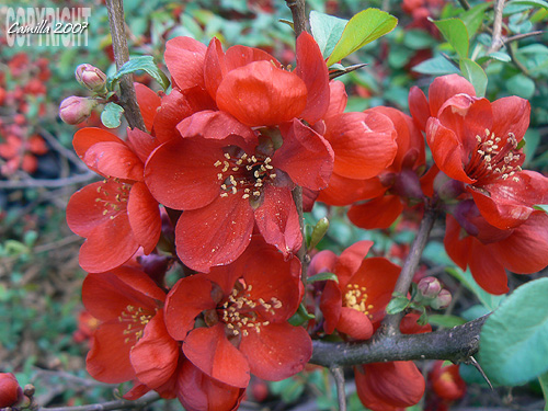 Vi har både stor & liten Rosenkvitten i vår trädgård - det här är den stora som har mer klarröda blommor och får större frukter. Fotograferad 070428.