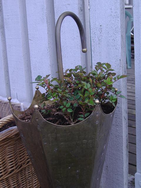 fick paraplystället i mässing tjäna som hem till denna ros (som övervintrade och nu börjat spira)