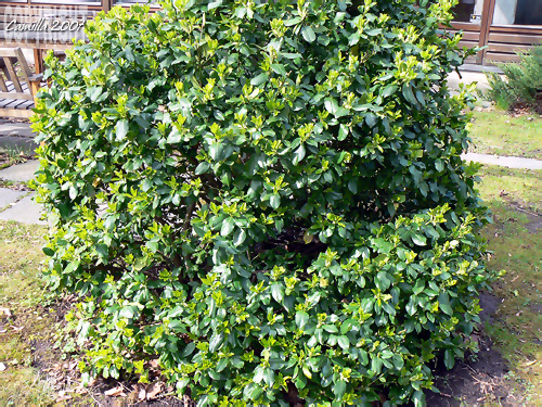 Den här busken har vi ett flertal av i vår trädgård. Vid altanen står en buske vid varje stolpe (runt stolpen) och den finns även på andra håll i trädgården men där växer den mer som en "klängväxt" och ligger delvis på marken. Troligtvis storbladig klätterbenved.