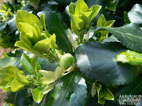 Så här ser bladen ut på den buske som högst troligt är storbladig klätterbenved som står bl a vid vår altan. Den buske som får mest sol är också den som är störst - men solen ligger på ojämnt just på altanen så den tredje busken är bara hälften av den första i raden eftersom den får minst sol.