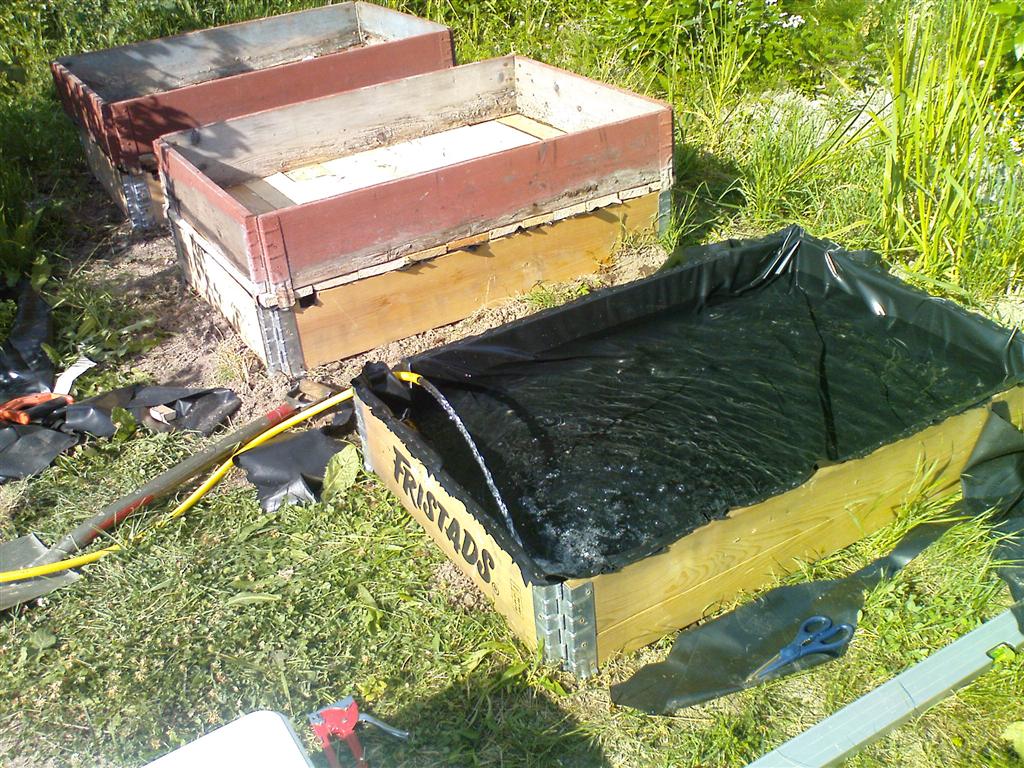 här är de tre självvattnande pallkragarna jag har byggt ihop och på sidan av varje krage har jag gjort ett hack så att det är lätt att stoppa in slangen och fylla med vatten.