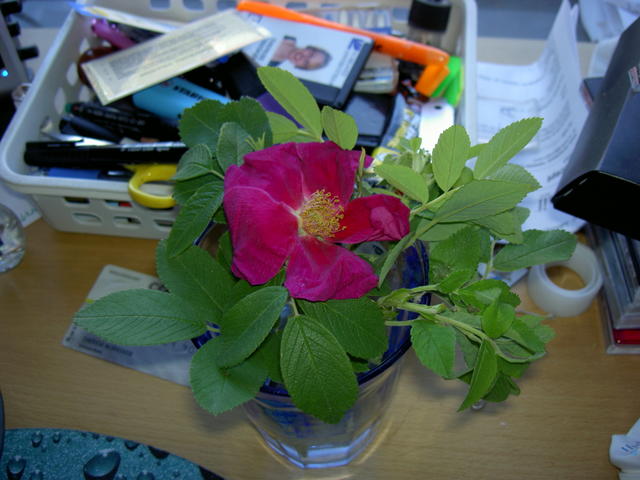 Okänd Rugosa plockad vid Campingen i Umeå. Doften är stark och god, massor av taggar, jättemånga rotskott. Blomman ganska stor, bladen fastare i formen än hos vresrosor och är inte fyllda. |