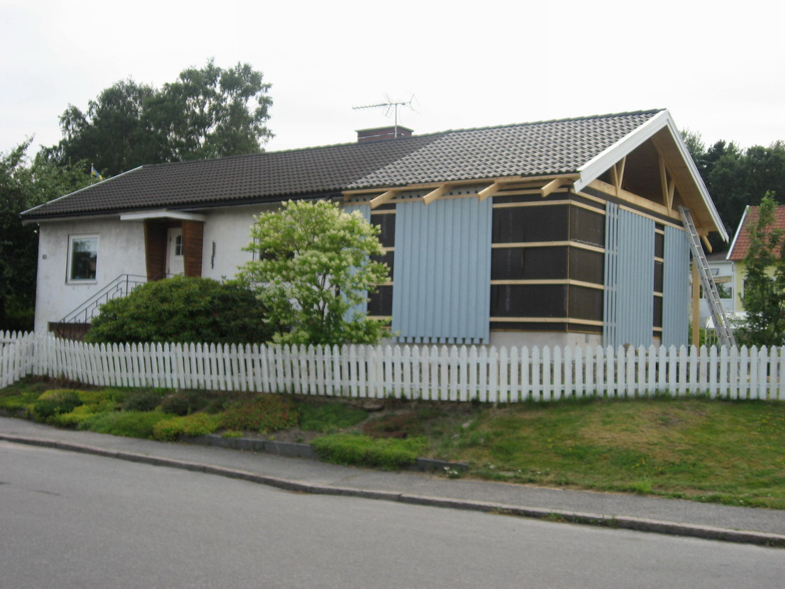 Jag skulle vilja ha tips om vad man skulle kunna göra med framsidan. Idag är utbyggnaden klar och gamla huset kommer också att bekläs med panel istället för den rappade fasaden. Vårt problem är rabatten som är intill trappan upp till huset. Idag har vi ett icke rakt staket som måste bytas ut eller tas bort. I rabatten har vi massor av olika perenner (lågväxande). Problemet är att vi idag får in massor av gräs från gräsmattan ovan. Jäkligt jobbigt att rensa rabatten med en fyraårig son. Vi vill ha en lättskött trädgård.