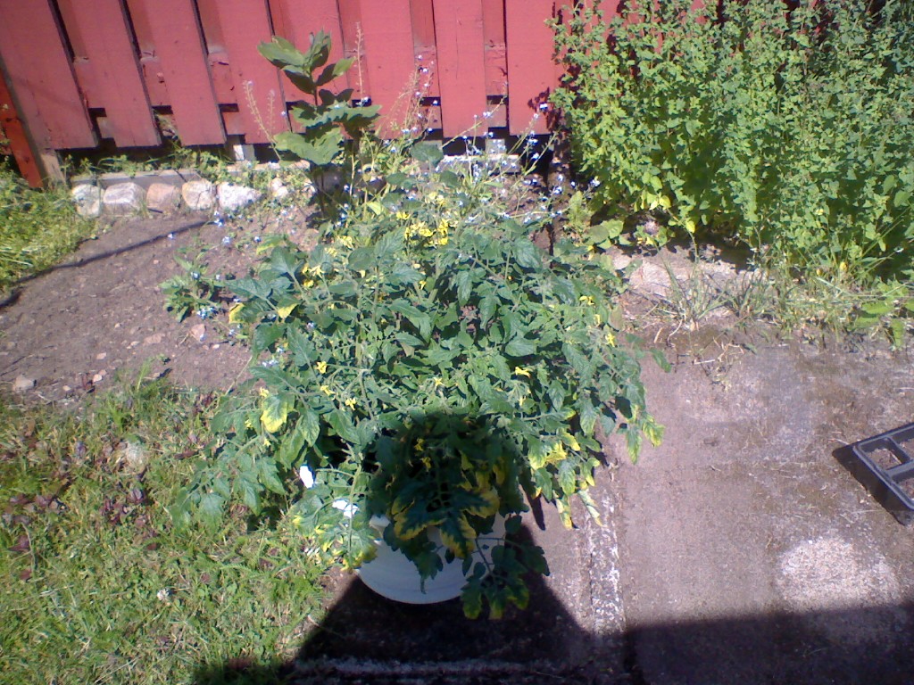 Årets Tumbling tomat har en söt historia. För två år sedan (-07) hade jag en Tumbling som jag köpt på vinst och förlust för att kanske kanske gick den att rädda. Och den växte till sig och jag fick så mycket glädje av den. Några frön hamnade hos Irené_L och hon fick upp plantor i fjol men jag lyckades inte med mina frön. Så bad jag om några nya frön från hennes planta och detta är resultatet. Jag fick 5 stora fina exemplar varav jag behöll två och de har så mycket blommor och tomater så de går inte att ha hängande längre.     Irené_L