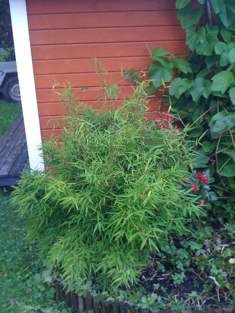 bergbambu "bimbo" bakom står en gammal minikrukros som sattes ut för 3 årsedan eller så, inte så mini längre, men blommar vackert varje år. man kan skymta vindruvan zilga med.