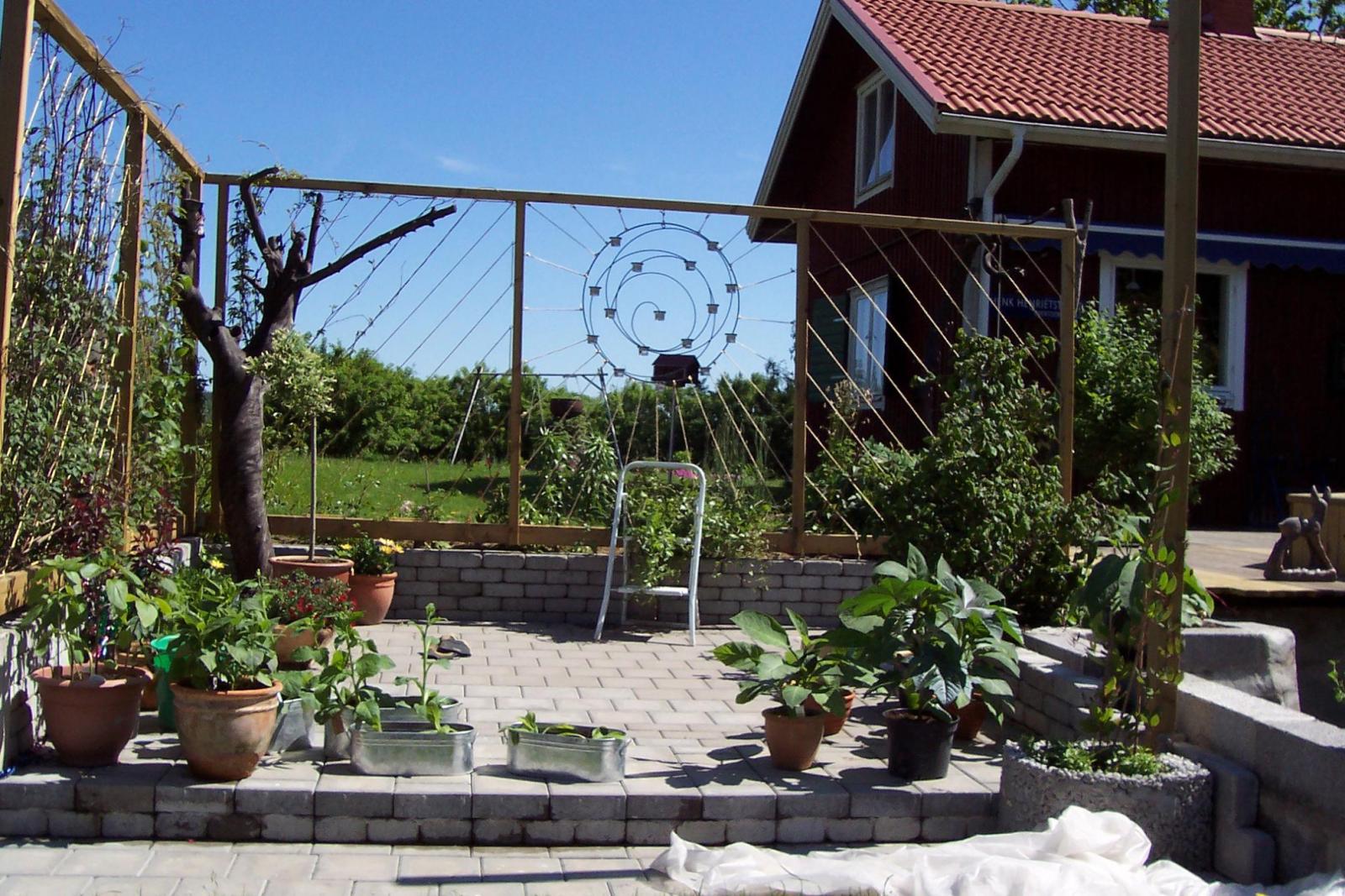 efter nyrenovering ser vår pergola ut så här. Ursäkta stegen, men den bidrog som stöttning för Gullclematisen.
