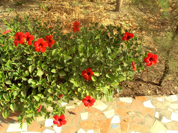 En del av våra häckar är hibiscus, den enkla röda sorten. Mycket tacksam, tål hård beskärning och blommar flitigt. Tyvärr angrips de ibland av ullöss, men då blir det att beskära igen.