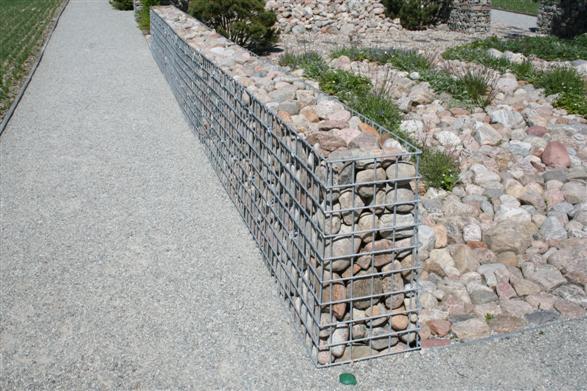 | Gabionerna i närbild. De verkar vara tillverkade av galvaniserad armeringsmatta (Armeringsmatta var för övrigt ett material som användes mycket runt om på Wij) |