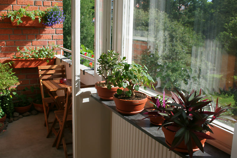 På fönsterbrädan kan man se blomstervagga, Pelargonium cotyledonis och Crassula ovata