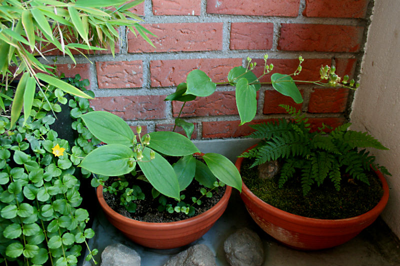 Fargesia murielae 'Bimbo', Lysimachia nummularia, Tricyrtis latifolia, Polystichum aculeatum, mossa