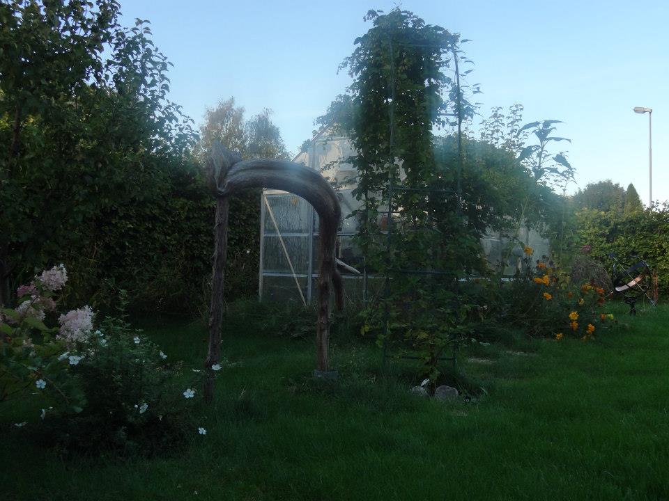 | Så var det dags att ta tag i "rummet" bakom växthuset. För mindre barn har jag gjort en ingång av en gammal en och för oss stora finns nu en pergola. Krusbär och vitölandstok ramar in rummet men här finns nog mer att göra. |