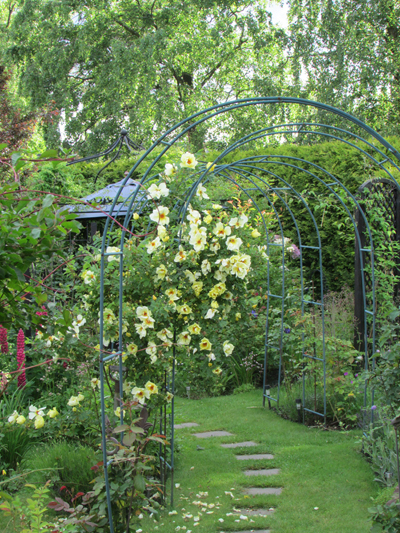Leder in till paviljongen I förgrunden risen Aicha. Underbar när den blommar i juni helt översållad av stora ljuvligt doftande blommor. Sen får min svartfläcksjuka och tappar mycket blad. Jag klipper den starkt och göder den. Sen växer den till sig igen och blommar med mycket färre blommor senare I rosgången finns även rosorna Goldstern,två A Shropshire Lad, Ghislaine de Feligonde, Penny Lane soch två skogskleamtis.