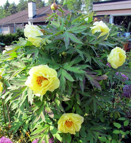 | Gul Buskpion, billigt fynd på Coop och flyttad tre ggn men nu trivs den lite varmare läge och blivit stor. Klipps inte ner, vedartad stam. Mycket stora blommor. 2019 |