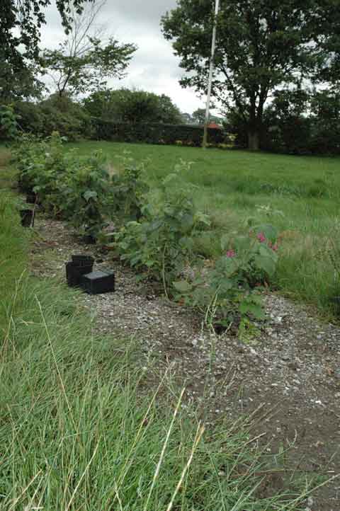 | Hallonen är köpta på Flyinge Plantskola påsken 2006. I denna trädgård har det bara vuxit gräs så länge jag har sett den, sedan 1993. OCH ÄNDÅ kommer det upp en rosa lejongap så fort man gräver bort grässvålen! Den skymtar bakom hallonplantan längst till höger. |
