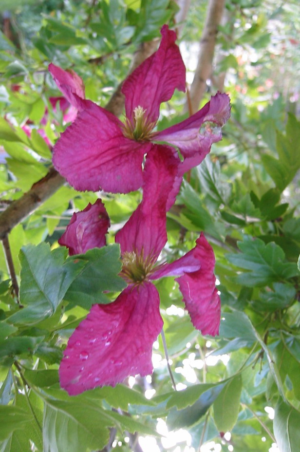 Klematisen 'Södertälje' uppe i pärlhagtornsträdet 'Toba'