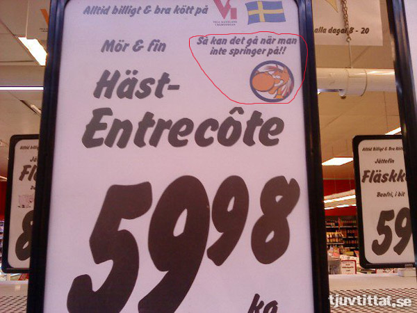 Jag jobbade ett tag i charkbranscen, en av gubbarna där hävdade som en självklarhet att många av de dyrare krogarna i Stockholm i smyg serverade hästkött istället för oxkött, och att det självklart också ofta var så på billigare krogar och pizzerior. Han föredrog själv hästfilé framför oxfilé, förutsatt att inte hästarna var gamla uttjänta och seniga travhästar.