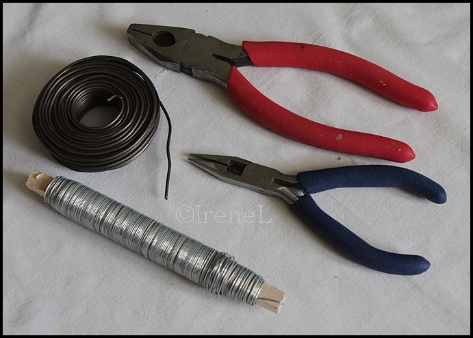 Jag använder najtråd 1,5 mm. (Förut hade jag även 2,0 mm men den får jag inte tag på längre.) Najtråd finns ex på Clas Ohlsson, Biltema, järnaffärer eller liknande affär. Sen har jag använt en smalare järntråd, vet inte hur tjock den är. Den är upplindad på en avlång spole när man köper den.