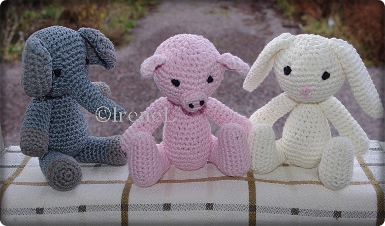 Jag gjorde först kaninen. Mönstret hittade jag när jag googlade: virkad kanin mönster. Sen gjorde jag de andra djuren efter detta mönster men ändrade lite så det passade djuren:
