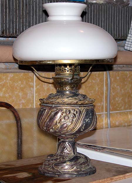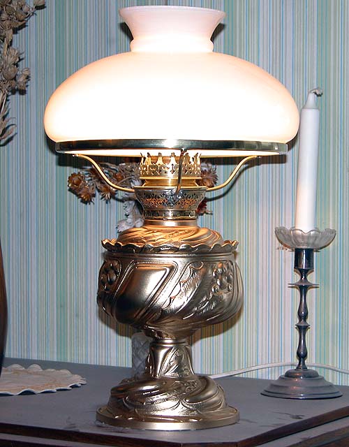 Sen har jag en lampa till som visas nedan. Den kommer från min mammas föräldrahem där den hittades på vinden vid boskiftet. Den var då i dåligt skick med kraftiga ärgskador som fick slipas bort. Redan då med el. Förmodligen härstammade den från syskonparet min mormor tjänat hos nån gång när förra seklet var ungt.