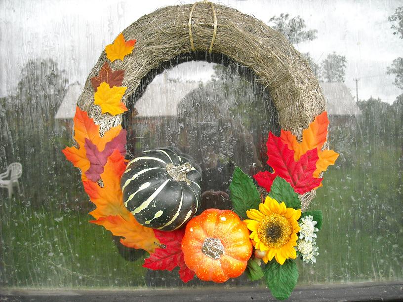 Jag är ingen höjdare på kransar, men tycker det är kul att göra dem ändå. Inte binda dem, men pynta dem. Har en vårkrans som jag hänger upp i februari, men den börjar bli väl sliten nu. Den får hänga hela sommaren till 1:a september då jag hänger upp min höstkrans (bilden) och lagom till första advent åker julkransen upp.