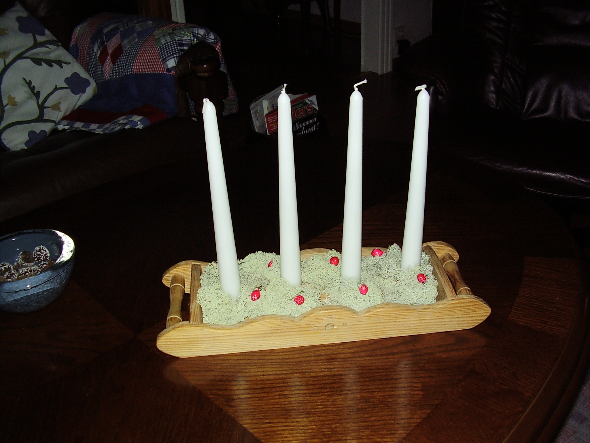 Min adventsljusstake är av litet format ca 16cm bred bara och ljusen är låååååånga och tjocka som julgransljus.