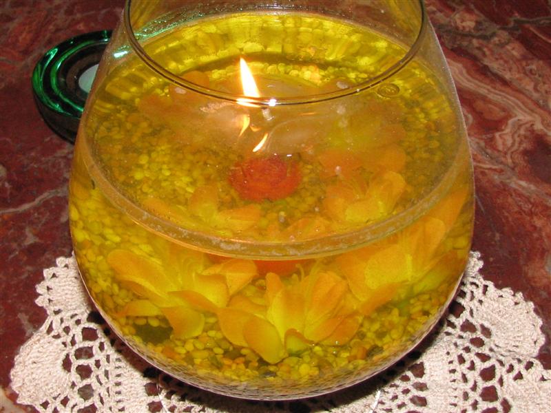 Jag brukar ibland sätta några flytljus och några dahlior eller rosor i en stor genomskinlig glasskål med vatten, det är snyggt. Min kusin föreslog att jag skulle ha i lite grodyngel, plantera näckrosor osv... giggle.gif