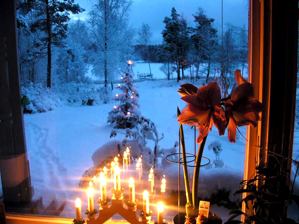Mörkret kommer ca 16.00 nu när vi fått lite snö här nere! Gryningen är väl vid 8.20 något på morgonen...