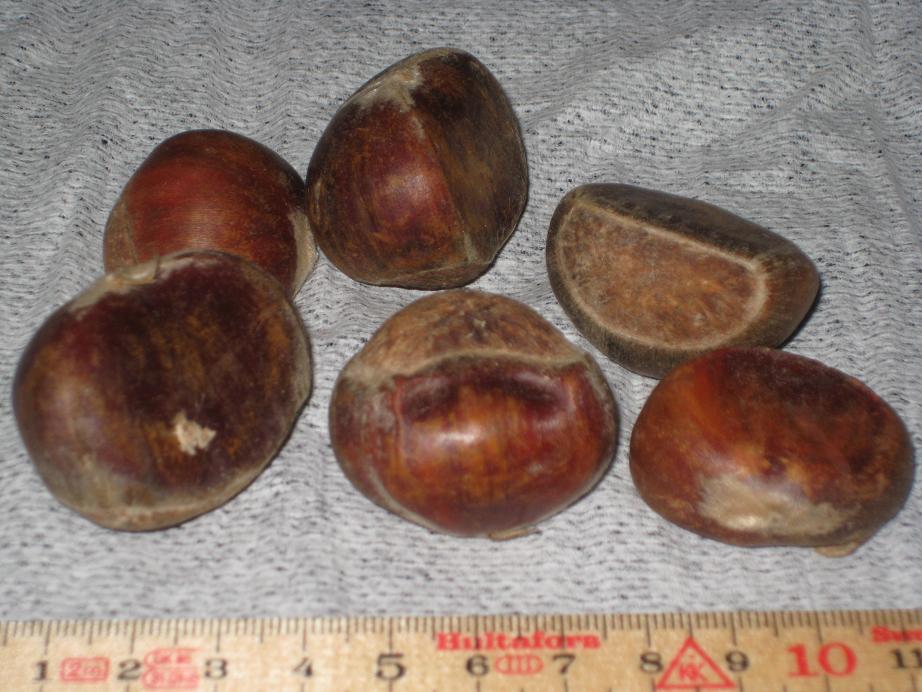 Det ser nog ut som äkta kastanjer, men jag är inte helt säker. De är ju platta på en sida, och äkta kastanjer ligger oftast två och två tillsammans så det stämmer ju.