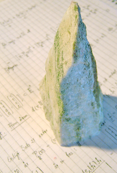 Den innehåller stråk av jade (hårt som kvarts) som omges av något slags kalkhaltig mineral som liknar marmor (gasutveckling när jag häller saltsyra över).