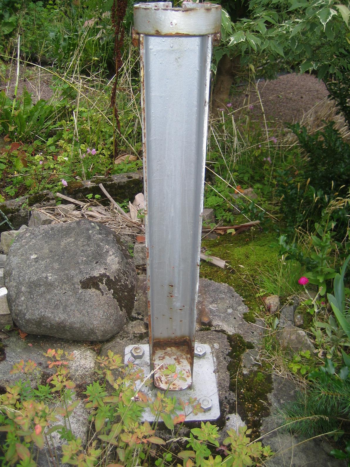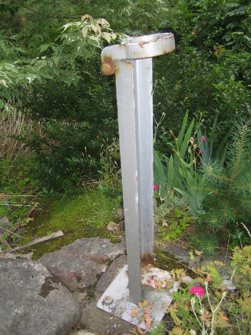 Tack alla! Jag har lurat ut att jag kan gjuta en "pelare" som sätts fast i bottenhålet med en bult som sen skruvas fast. Så den delen är helt ok. (har hittat en plastflaska som passar perfekt, bara lite fönsterlister av gummi som stadgar) så sitter den som berget nertill. (cola-flaskan var för stor, ciderflaskan för liten men Sprite-Zero perfekt) Det enda jag är orolig för är att stången inte går av i höjd med ringen eftersom den inte kan röra sig ända ner när det blåser..... Rosten på fästet är bara ytrost som jag naturligtvis skall ordna till innan uppsättningen. Fästet är c:a 50 år gammalt eftersom min Farfar var smed, och dom köpte tomten 1938 och började greja här då, så förstår ni nog varför jag gärna vill använda det som finns..... tack för alla svar, jag skall nog slänga iväg ett samtal till någon tillverkare och så får vi se vad dom säger...... Kram och tack så länge, är det någon som kommer på något mer genialt så hör av er...