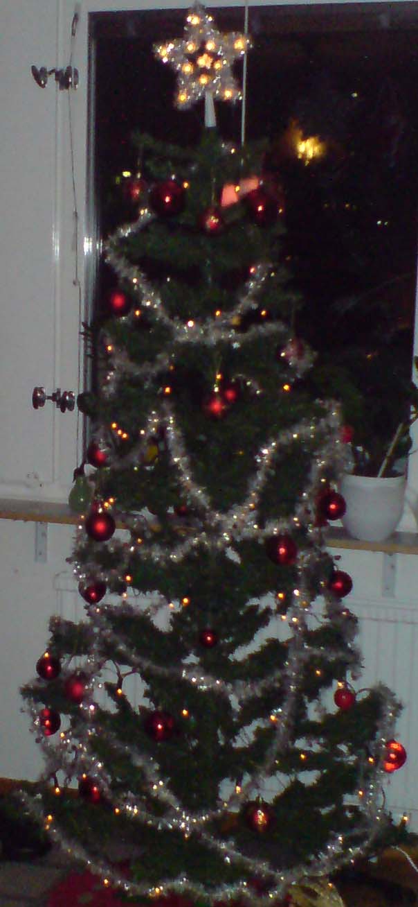 Hej igen: En så vacker gran! Det är väl så att på håll ser dom äkta ut och med mycket glitter och kulor så... Vår ligger på vinden fortfarande men snart skall den ner. Och det känns knepigt. Vi har ingen "granallergisk" i vår familj; dottern tål inte hyacintdoft men jag ställer undan dom när hon är här (det står tre st på köksbordet just nu och dom doftar ljuvligt!).