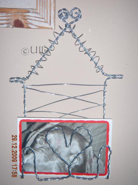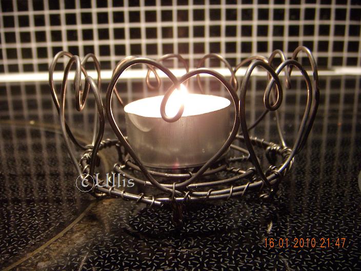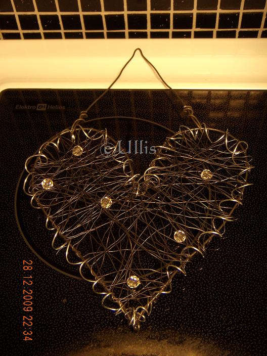 Ståltråden hade jag använt till något, men sen ångrade jag mig och tog bort den från ett hjärta tror jag. Satte dit lite pärlor på den tråden och virade den till tre rundlar. Ordet 'Lycka' fick pryda den. Fin, tycker jag.
