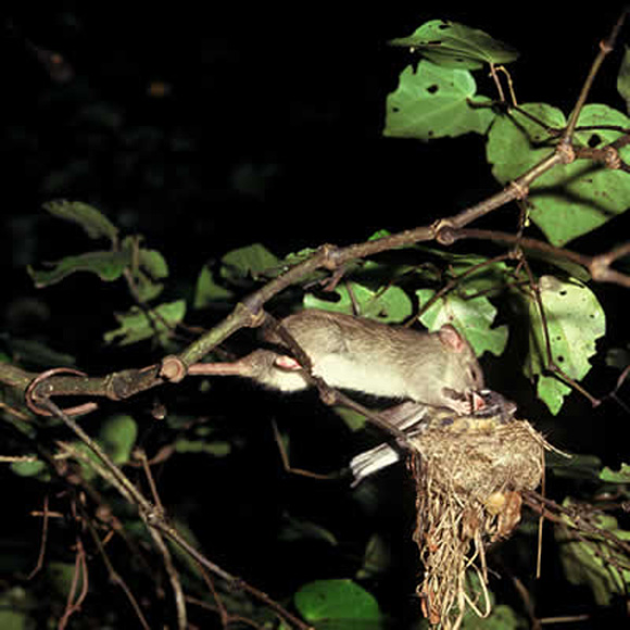 Bilden visar en Fantail på sitt bo med ägg samtidigt som en råtta börjar äta på den!