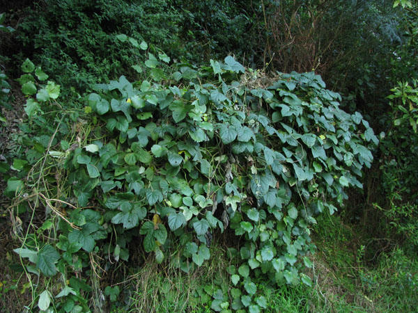 bild 3 är en blomman fördagen som börjat kväva en stackars kawakawa, macropiper excelsum. jag har börjat rensa bort lite, men den är så jäkla intrasslad.