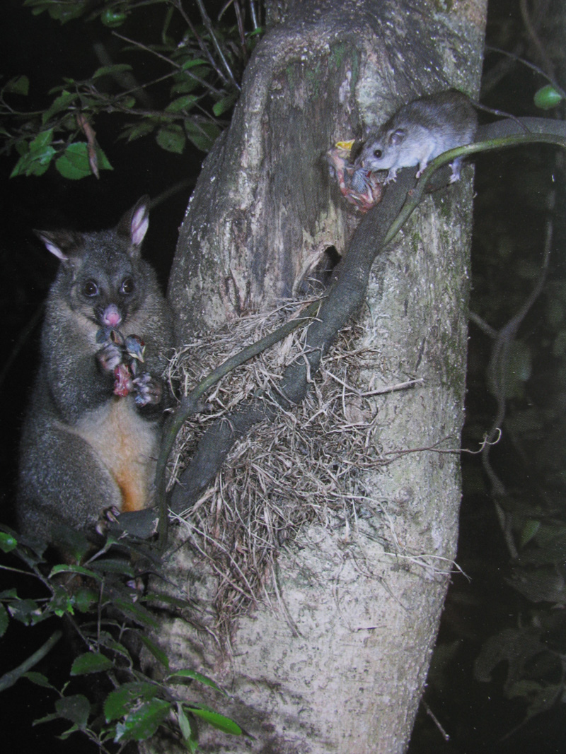 En Possum och en råtta som tillsammans kalasar på varsin fågelunge. Blev nog inga tuis i den kullen.