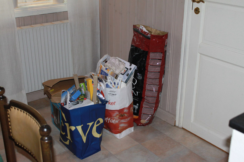 I den tomma hundmatsäcken samlar jag tidningar och reklam (den väger bly när den är full!) Påsarna med kartong och mjölkförpackningar bränner vi i kaminen till vintern. Bakom allt detta finns det en påse med flaskor och burkar som ska pantas.