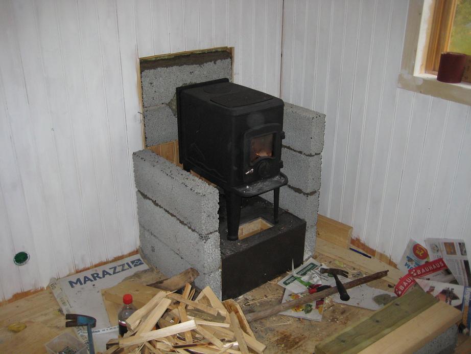 Här är en bild på kaminhörnan som jag bygger i stugan. Det skall bli ett avfasat lecablock till på höger sida och två på vänster, sedan skall dom putsas och målas vita. Väggen skall också målas minst en gång till, ifall någon undrade. Lägg märke till friskluftsintaget i sockeln, det gör att kaminen slipper suga i sig den uppvärmda inomhusluften. Det är ett eget patent, och det skall läggas på ett galler så småningom.