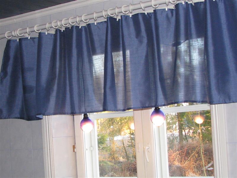 Nu ska det bli nya gardiner här. Har jag tänkt läänge. En blå kappa till badrumsfönstret skulle sitta fint. Och nya gardiner i sovrummet, de gamla har vi haft sen vi flyttade in för snart tio år sen, så det börjar bli dags! Hittade billigt tyg i Arninge, 100 kronor hela biten. Räcker säkert till en kappa till badrumsfönstret och nya gardiner till sovrummet. Tog fram tygbiten och såg att jag får sy runt om, inte en enda stag-kant. Skred till verket, måttade och tyckte att det räcker till båda rummen. Tråd i samma färg köpte jag också. Men symaskinen tyckte inte om att bli störd en lördag, undertråden korvade sig. Hade sytt en meter innan jag märkte det. Lätt att sprätta upp. Spände tråden, men då gick den bara av. Lossade litet och sen gick det bra. Här ser ni resultatet. Snyggt, va ? För 100 kronor...