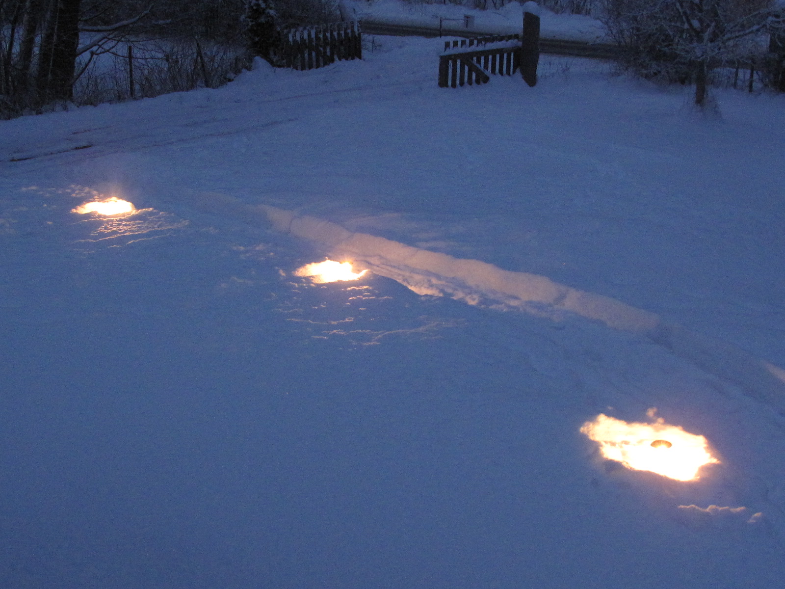 Så här ser det ut ikväll utanför dörren. Våra halvmeter höga lampor fick vi leta efter i söndags