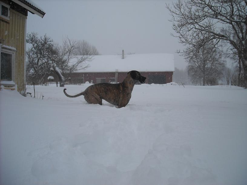 Grandisen Alfons står "på" en ihoptrampad stig som är ca 25-30 cm hög under den nya snön som nu når upp till fönstret. Min lilla trädgård, med stenar, buskar, sittplatser och pynt och allt finns någonstans, djupt där nere.