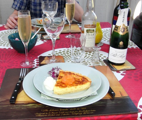 Förrätt: Hemgjord västerbottenpaj med cremefraiche och hackad rödlök. Champagne.