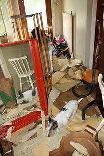 Här rivs det tapeter för glatta livet och hatthyllan är nerplockad. Den blev utmärkt som 'tänneved' till pannan.