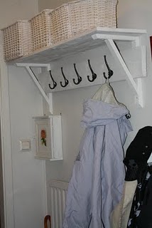 Köpte två träkonsoller, en hyllaskiva, krokar och korgar på IKEA.