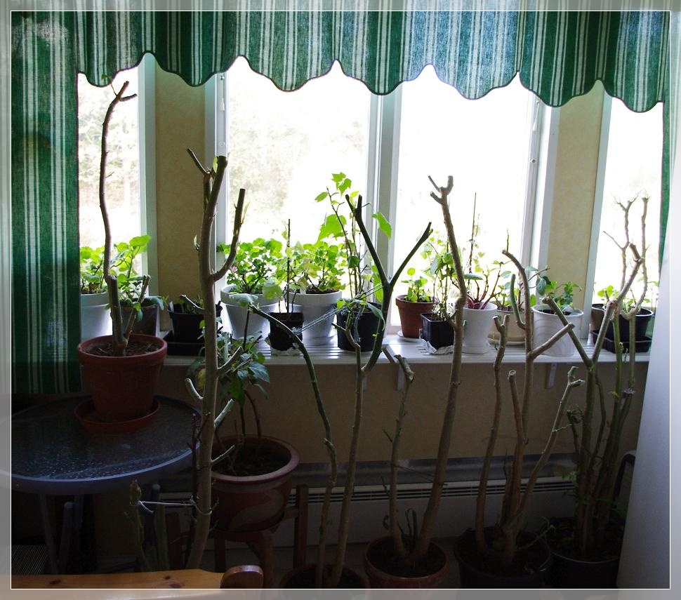 Nu är det fullt i mitt "övervintrarfönster" i den övre hallen. Framför fönstret står det änglatrumpeter. Här brukar jag försöka hålla ca 17-18 grader!